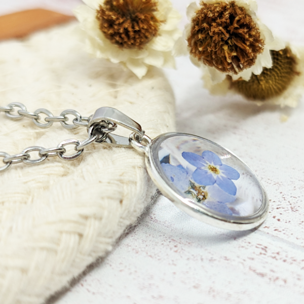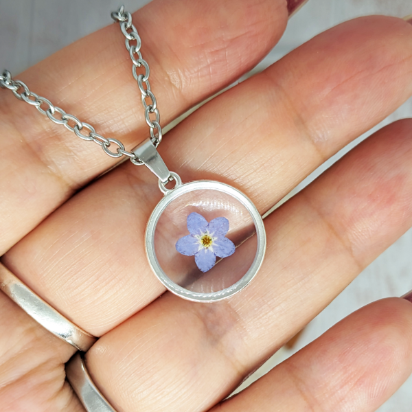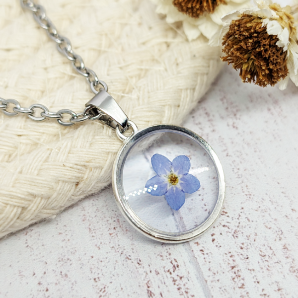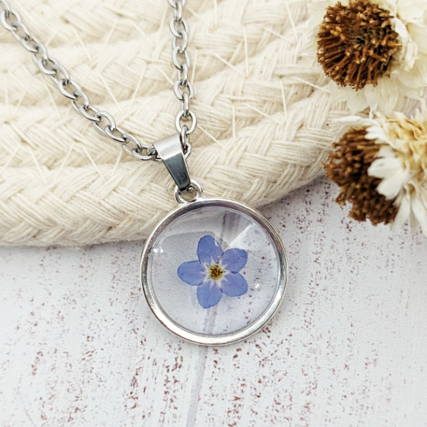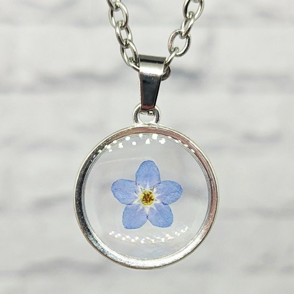 ¡Llevá con vos un pedacito de naturaleza! Este collar es super especial porque tiene la flor Myosotis, conocida comúnmente como Nomeolvides, que además de tener una sutil y delicada belleza, tiene mucho significado y una historia detrás.